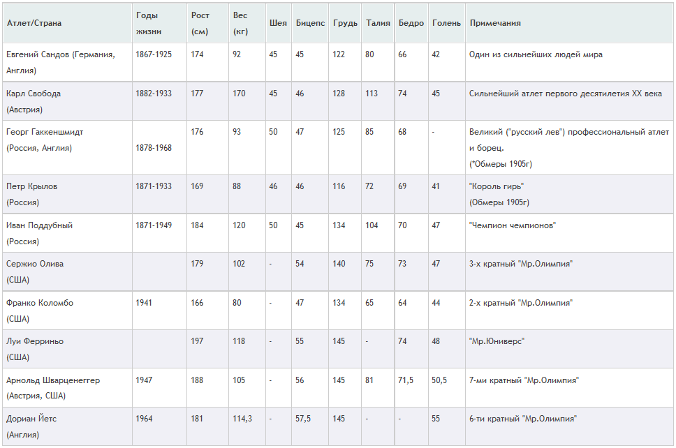 Вот, откопал статистику по антропометрии знаменитых атлетов, думаю, Вам она покажется любопытной (см. табл.).