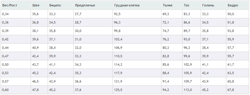 Также свои идеальные пропорции на основании веса и роста можно узнать из следующей таблицы (см. табл.).