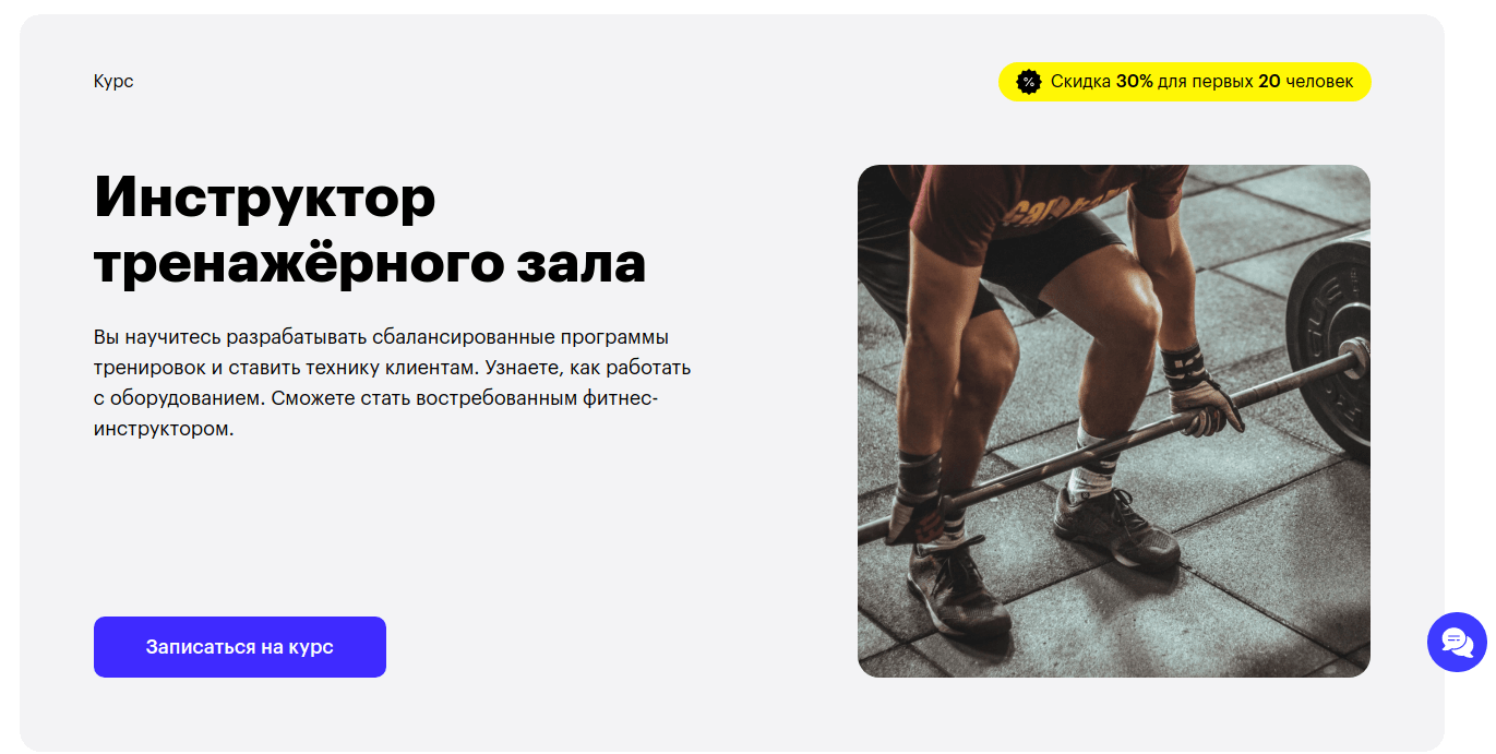 Обучающая программа: вы научитесь разрабатывать сбалансированные программы тренировок и ставить технику клиентам. Узнаете, как работать с оборудованием. Сможете стать востребованным фитнес-инструктором.