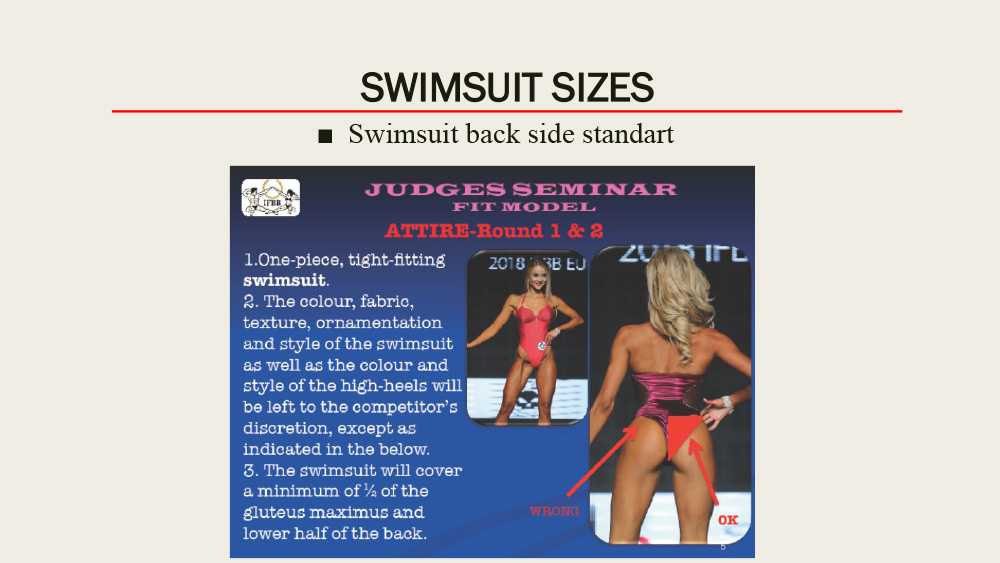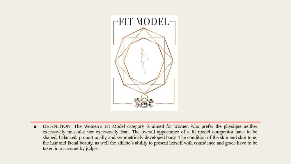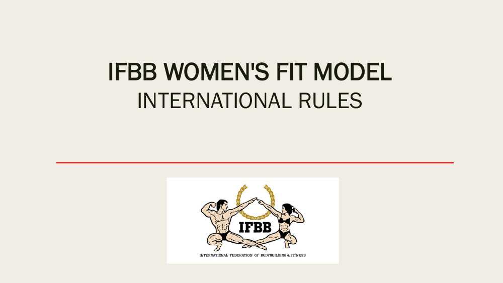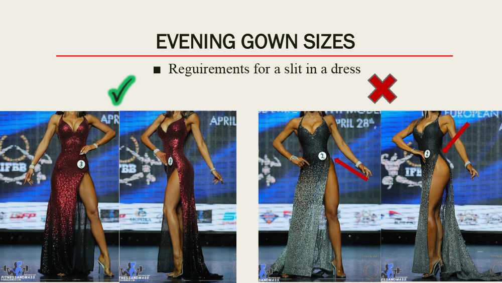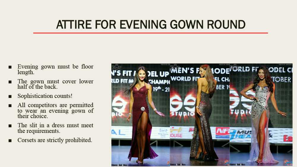 Фит-модель — сплошной, плотно-прилегающий, из непрозрачной ткани, без вставок сетки купальник. Цвет любой, минимум ½ часть ягодиц и нижняя половина спины должны быть закрыты! Вечернее платье длиной до пола с регламентированной глубиной разреза, также должно закрывать нижнюю половину спины. Цвет и текстура на выбор спортсменки. Использование корсета строго запрещено! Соревновательные туфли: толщина подошвы не более 1 см, высота каблука не более 12 см. Платформа запрещена. Украшения можно использовать в соответствии со вкусом спортсмена.