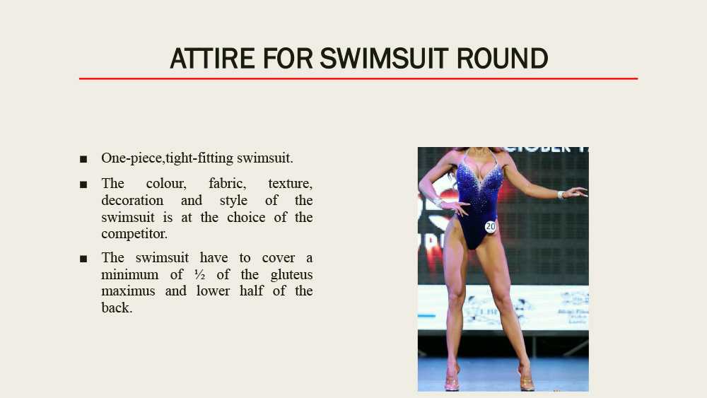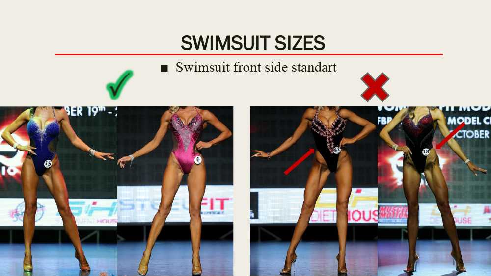 Купальники у девушек должны быть открытыми и важно, чтобы участницы были в туфлях на высоких каблуках. Во время показа спортсменки обильно смазываются специальным гримом