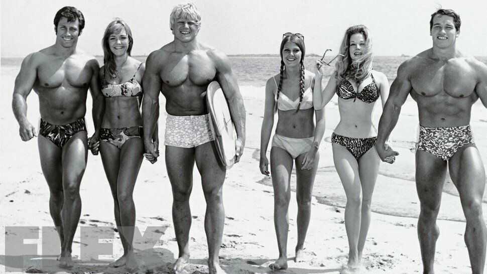Совместная фотосессия звезд бодибилдинга для журнала «Muscle Builder». 1970 год. Арнольд Шварцнеггер (справа) Фрэнк Зейн (слева), Дейв Дрейпер и Бетти Вейдер (вторая справа), а также несколько ее подруг.