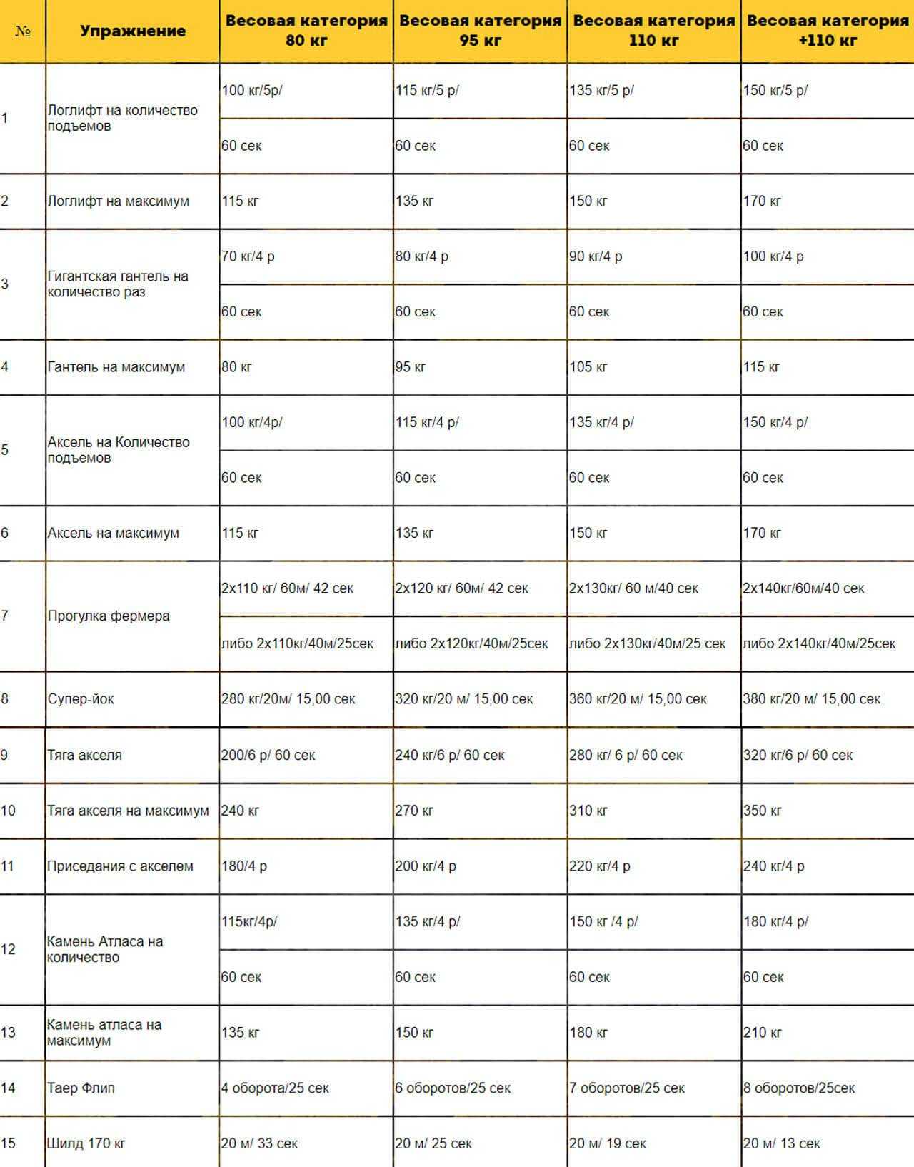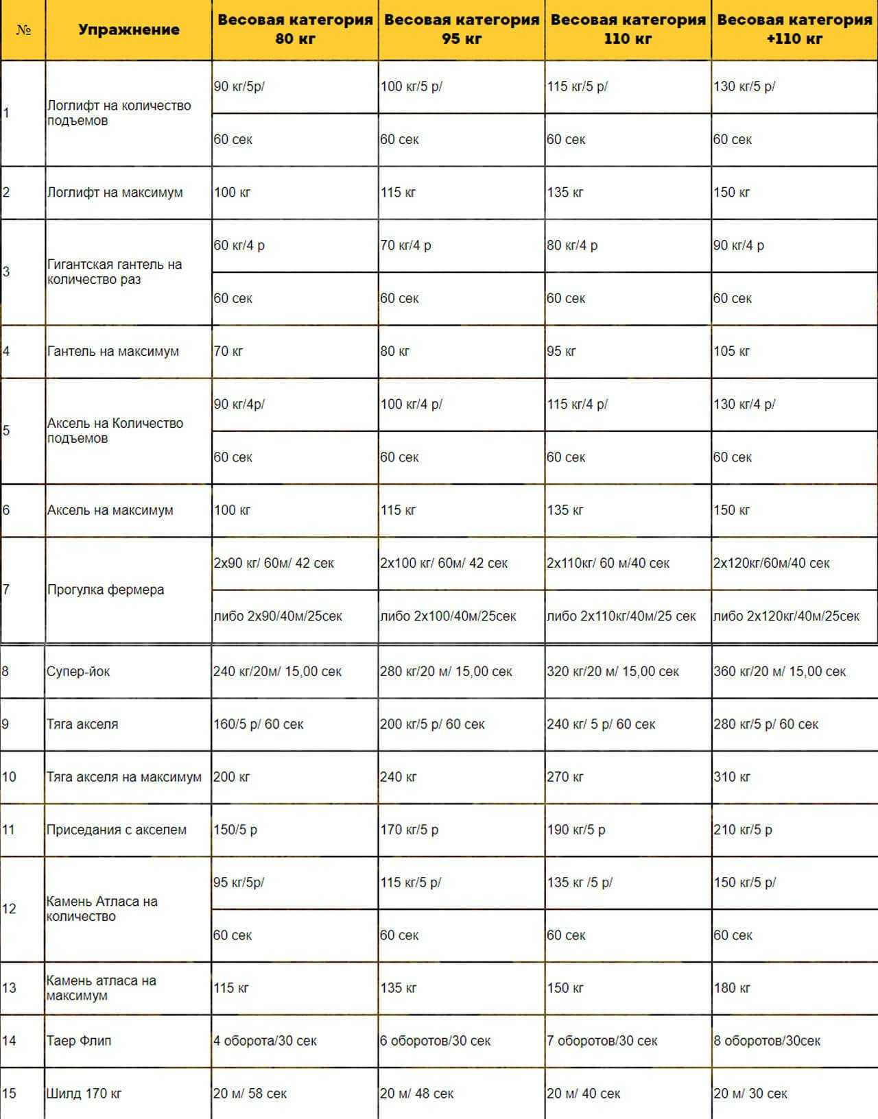 Стронгмен в РФ имеет официальный статус, благодаря чему спортсмены имеют разряды и категории. Каждая категория имеет свои нормативы по времени, тоннажу или прочим критериям, которые соответствуют уровню спортсмена.