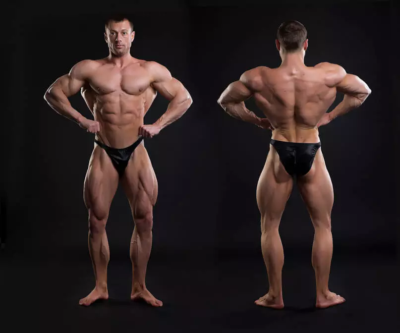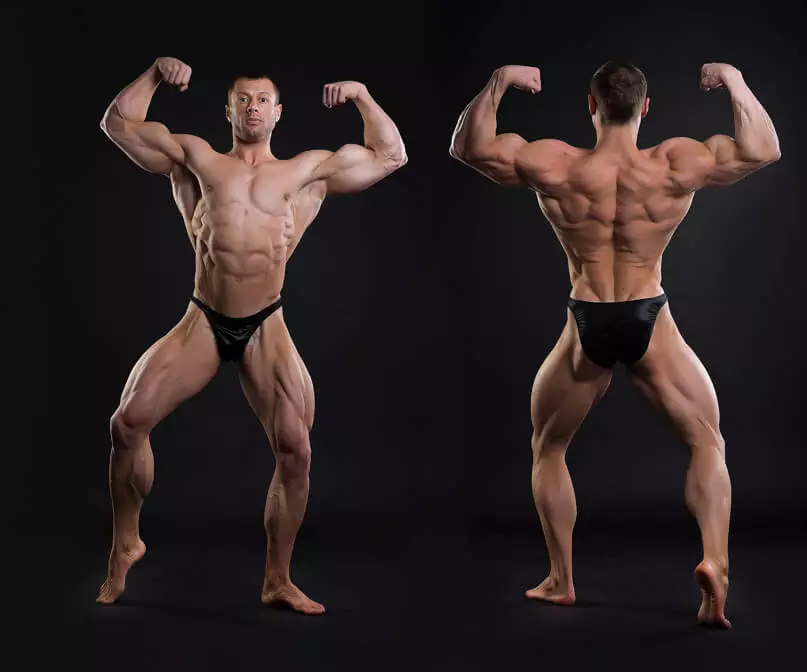 Для демонстрации широчайших мышц сзади выполняется все то же самое, только немного увеличивается прогиб в пояснице. Ноги должны оставаться в том же положении. Так же при виде сзади напрягаются голени и ягодицы.