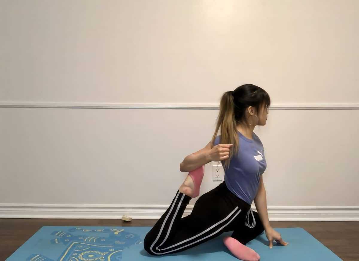 - Занять позу голубя с правой ногой спереди. Согнуть ногу позади так, чтобы пальцы были направлены в потолок