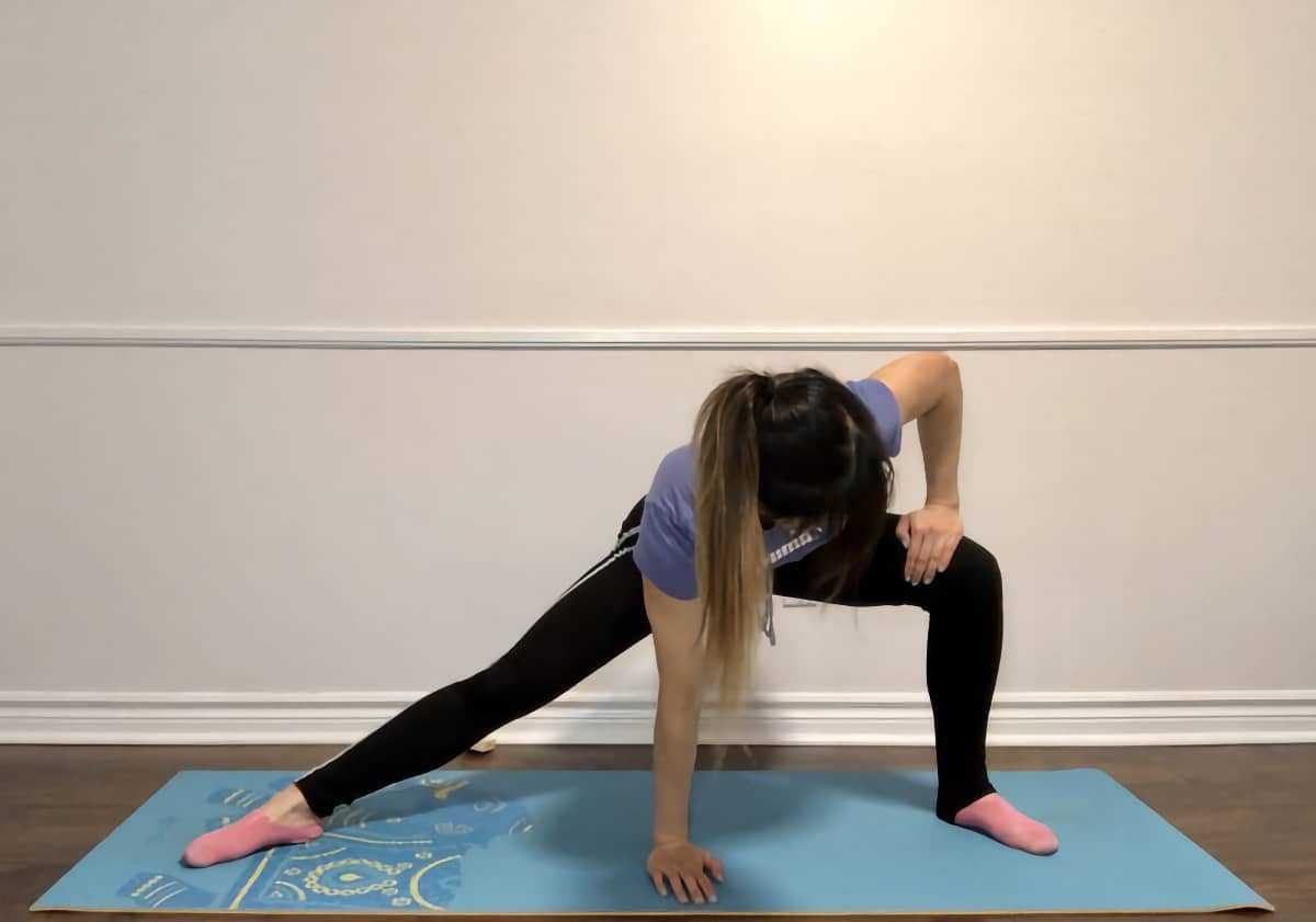 - Тянитесь торсом к бедру, а не к пальцам передней ноги