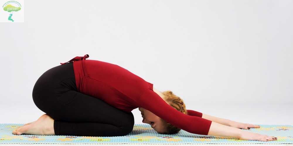 Сесть на ноги ягодицами, на колени положить живот, голова между коленями, руки вытянутые на полу.