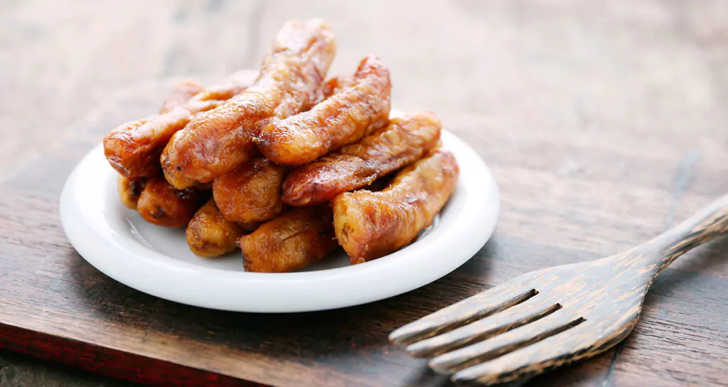Сушеные бананы в несколько раз калорийнее обычных свежих, поэтому являются хорошим питательным перекусом, который полезно употреблять в первой половине дня (например, во время ланча), при этом в сушеном банане сохраняются все полезные витамины и микроэлементы, как и в свежем фрукте.