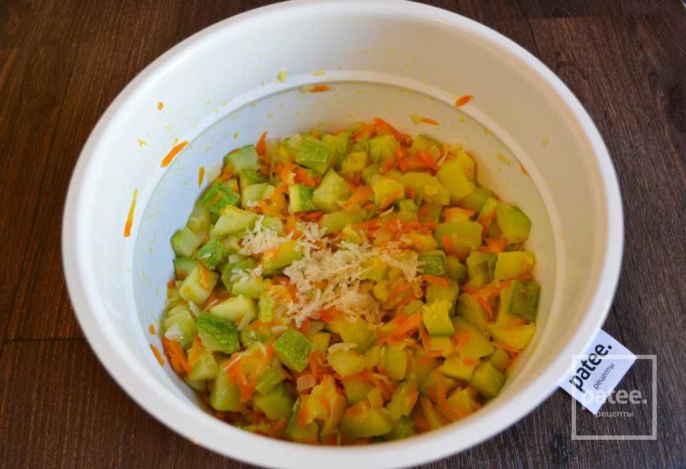 1.Молодые кабачки нарежьте кружочками, толщиной около 3 см. Обжарьте их на растительном масле. Они должны ужариться на 25%. Выделившийся сок не выливайте, а добавляйте в общую массу.