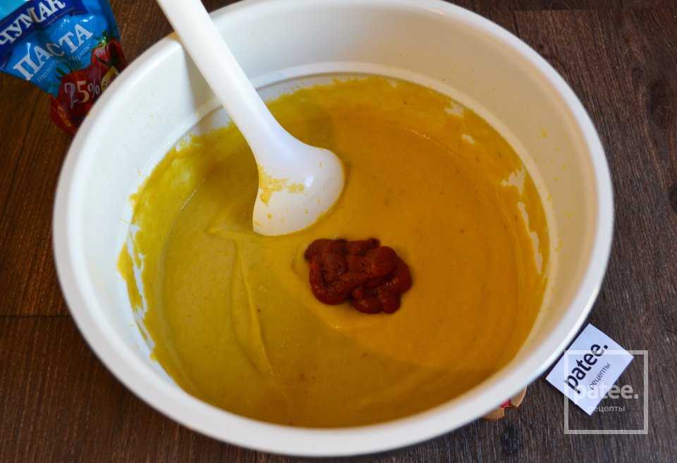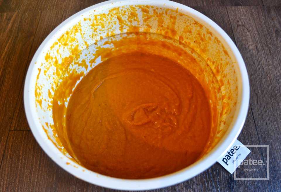 14.Добавьте к овощам обжаренную томатную пасту с чесноком и маслом и перебейте все погружным блендером до однородности.