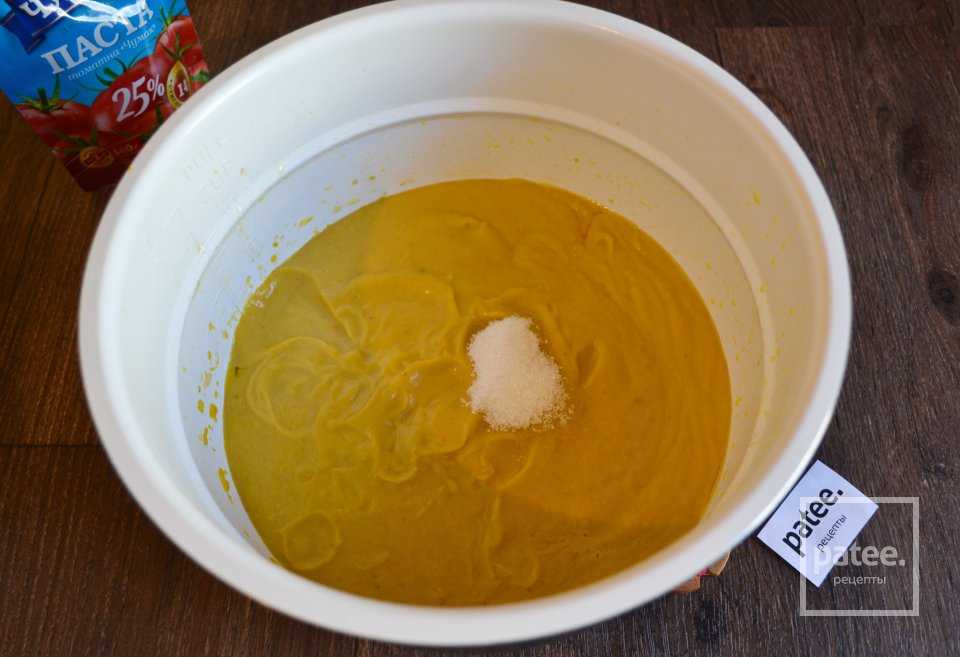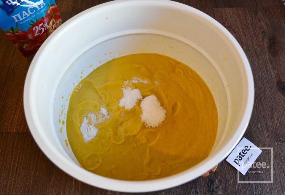 11.Добавьте 50 граммов томатной пасты 25% и обжарьте вместе с чесноком 2 минуты, помешивая. Жареная паста становится ароматней, чем сырая, и даст более насыщенный цвет икре. В пасту положите сахар, чтобы сбалансировать кислоту (около 1,5 ч.л.). Попробуйте, чтобы был приятный кисло-сладкий вкус.