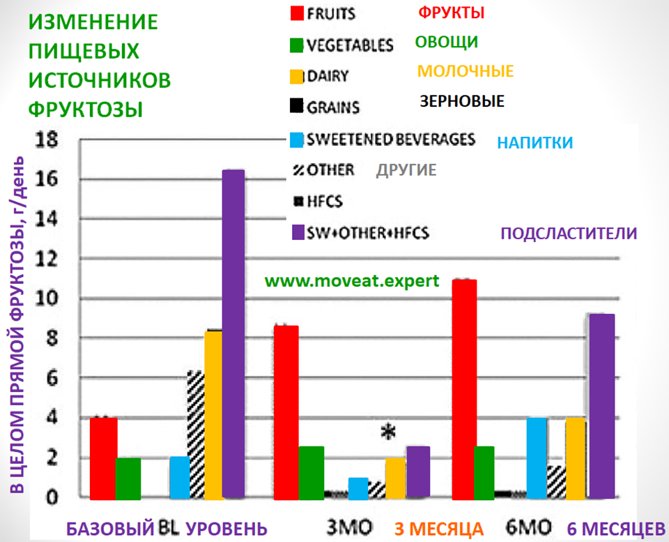 Напомню, что испытуемые при этом кушали гораздо больше фруктов и меньше — продуктов с добавленной фруктозой.