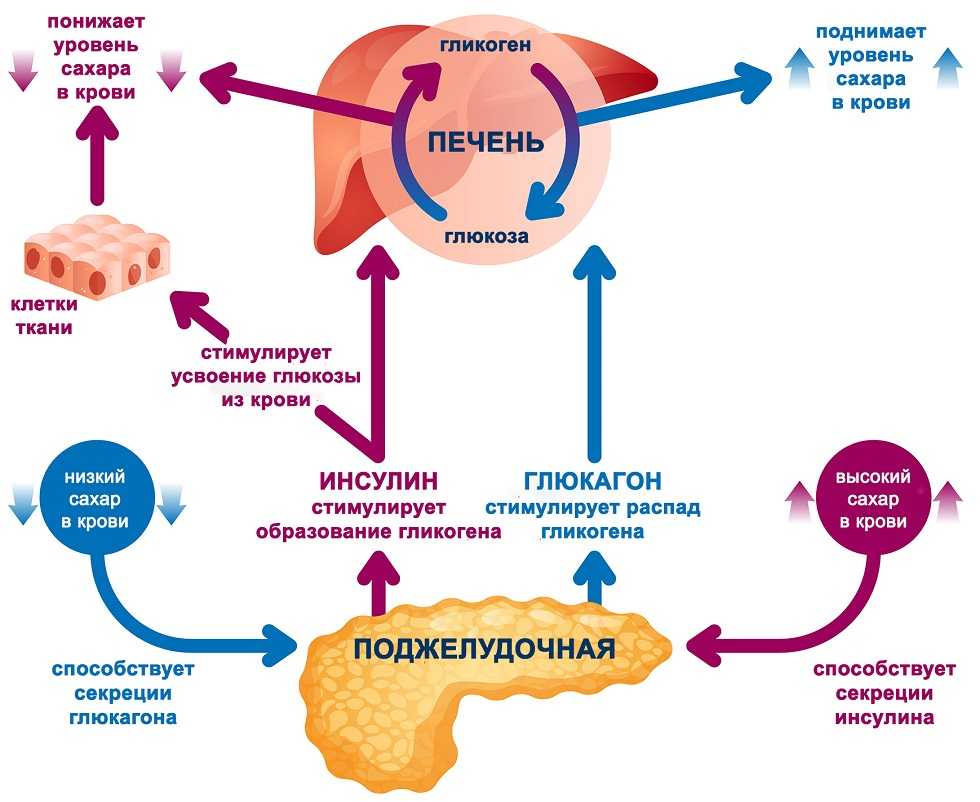 Вторым важным фактором на этом этапе обмена углеводов выступает глюкагон. Этот гормон определяет, нужно ли печени работать с внутренними источниками или с внешними.