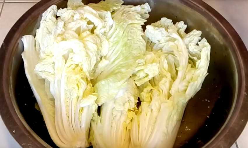 1. Капусту освободить от мятых или испорченных верхних листочков, разрезать кочаны пополам вдоль и замочить в воде на 15-20 минут, а затем воду слить. Капусту хорошо пересыпать солью, чтобы она была распределена между всеми листочками, и подержать 4-5 часов при комнатной температуре.