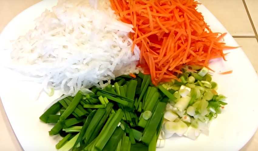 3. Дайкон и морковь очистите и нарежьте тонкой соломкой с помощью ножа или специальной терки. Зеленый лук порежьте на кусочки, длиной 5 см. Белую (толстую) часть лука накрошите мелко.