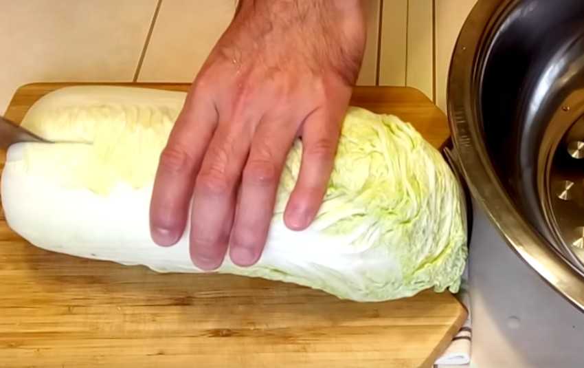 1. Вилок разрежьте от низа кочана до половины. Потом аккуратно разделите руками, чтобы не повредить листья. Если кочан большой, разрежьте каждую часть еще напополам. Промойте в холодной воде, удалите букашек и плохие листья (если есть).