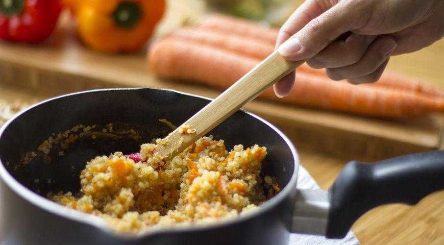 - Готовые овощи положите в кастрюлю с киноа, перемешайте.