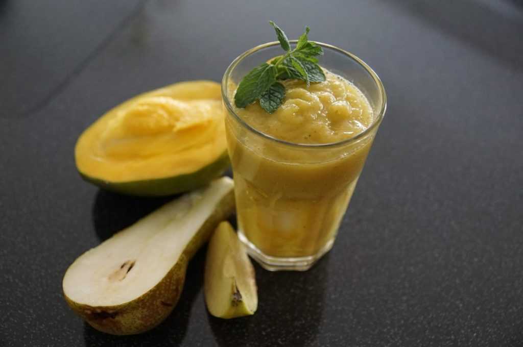 Фрукты нарезают не слишком мелкими кусочками и ненадолго помещают их в морозильную камеру. Затем охлажденные дольки заливают двумя разновидностями сока и измельчают в блендере. Готовый напиток подают в красивых стаканах, предварительно украсив кусочками свежих фруктов.