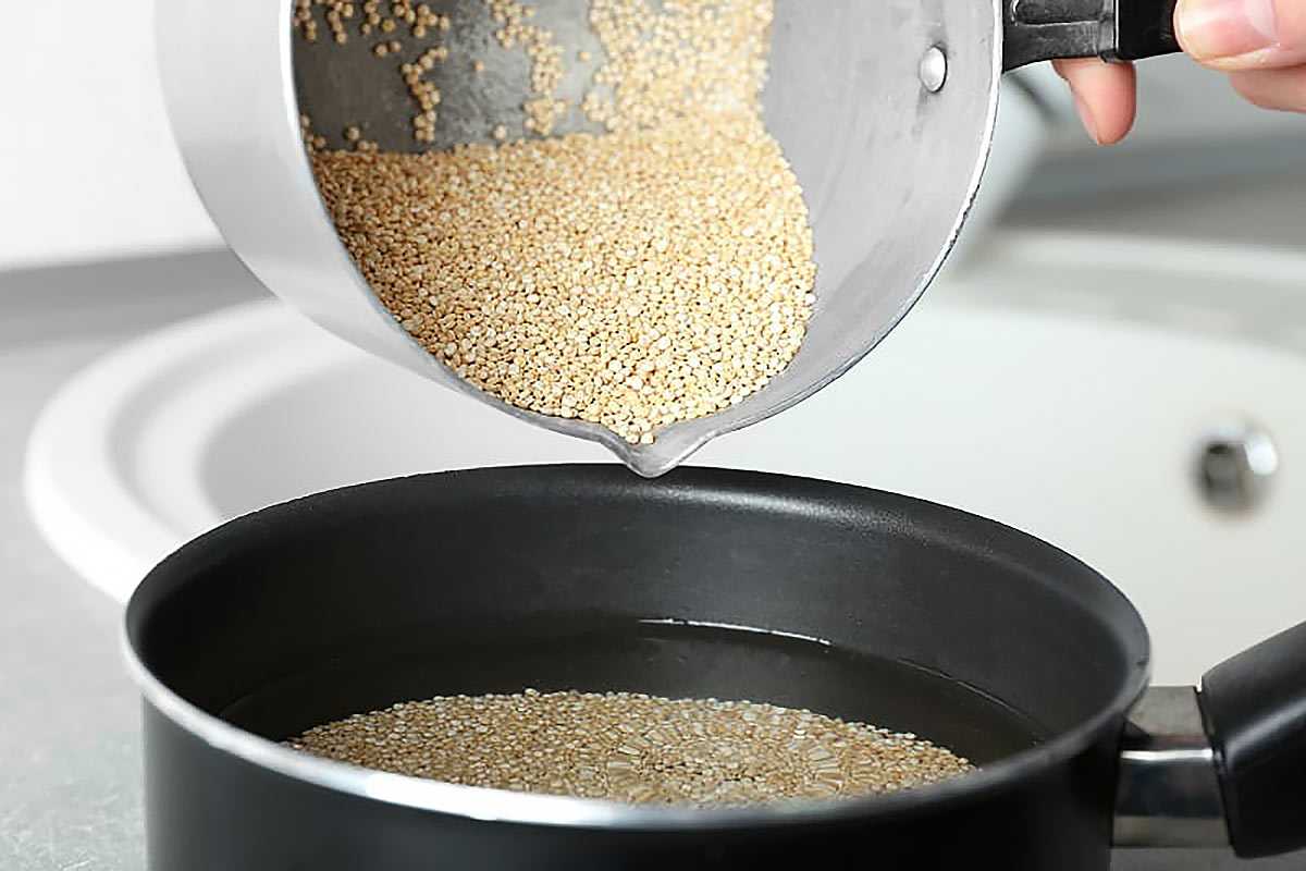 Для того, чтобы избавиться от горького вкуса, перед варкой киноа замачивают в холодной воде — как минимум на 30-45 минут. После этого крупу промывают под проточной водой в мелком дуршлаге или при помощи марли (иначе зернышки будут смыты).
