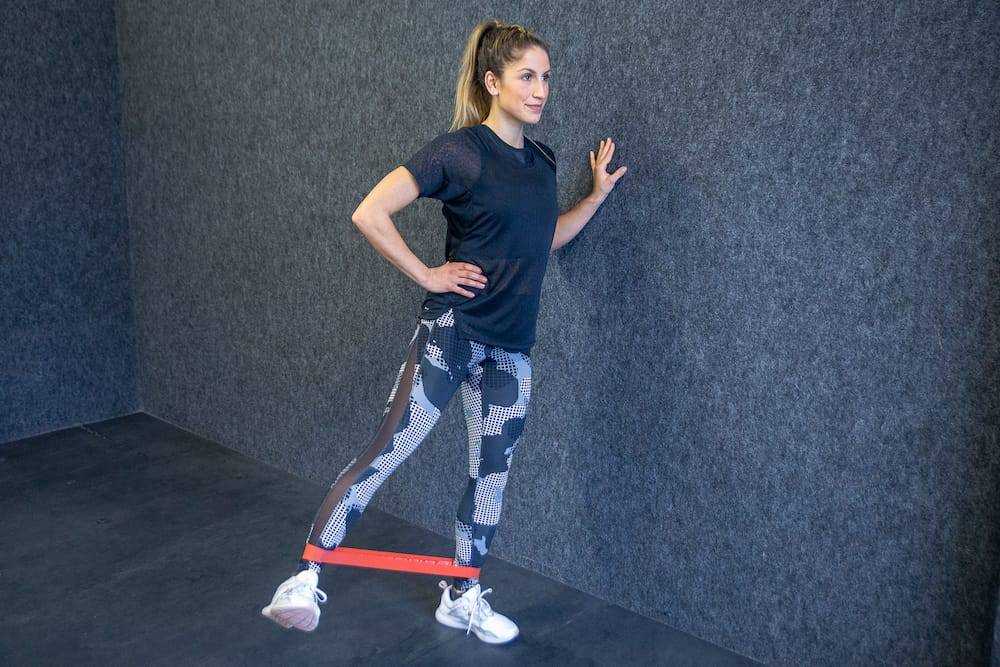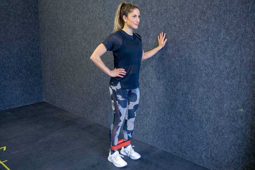 - Встаньте рядом со стеной и держитесь за нее рукой. Лента должна быть размещена вокруг ваших лодыжек. Вы можете уменьшить сопротивление, перемещая ленту выше колен.