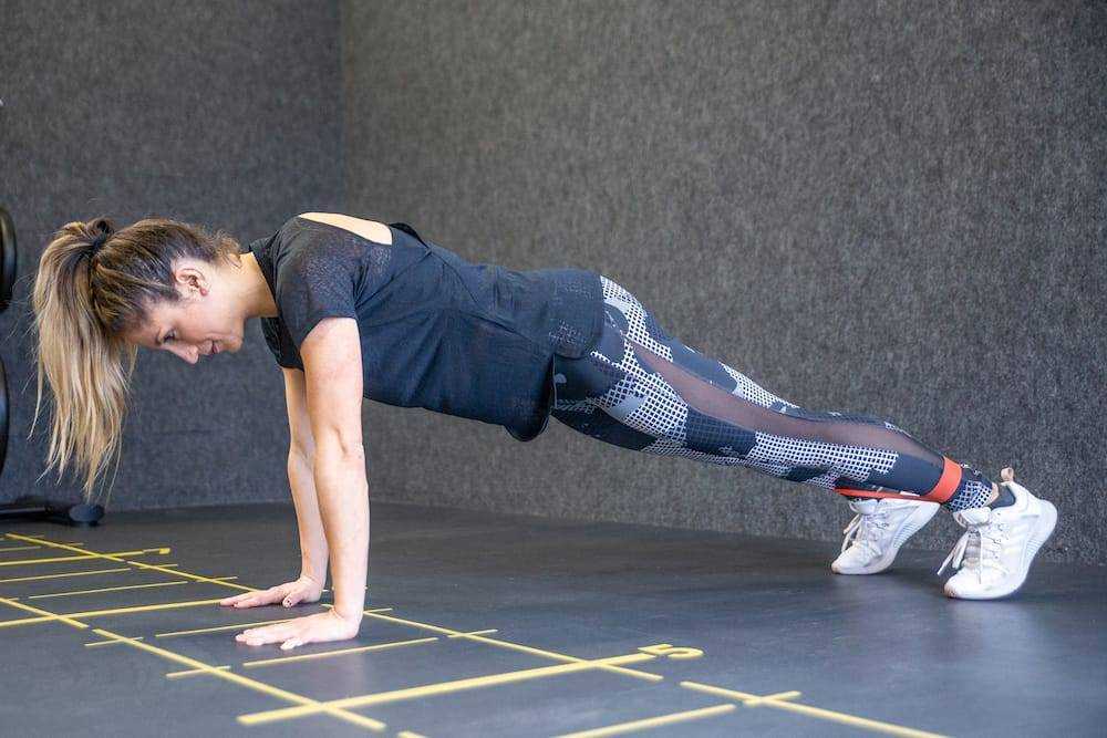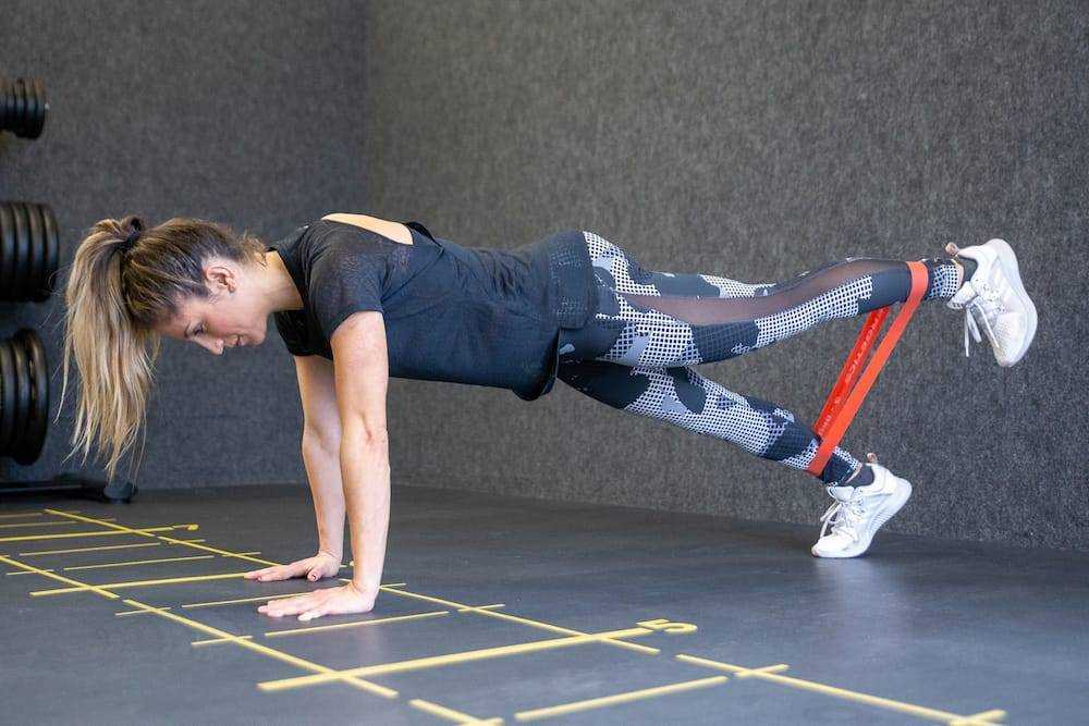 - Держите свое тело в высоком положении планки так, чтобы руки и ноги касались земли. Ваши руки должны быть под вашими плечами. Эспандер для фитнеса должен быть размещена вокруг ваших лодыжек.