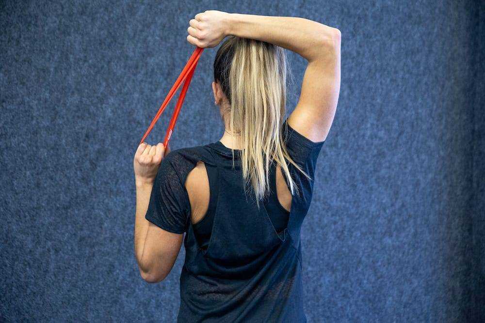 - Вытяните правую руку, держа ее близко к голове. Когда правая рука выпрямляется, вы должны чувствовать растяжение резинки и работу мышц правой руки.