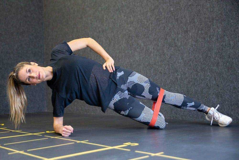 - Держите свое тело в положении боковой планки. Ваша правая нога согнута, а левая выпрямлена, так что правый локоть, правое колено и левая нога касаются земли. Резинка должна быть размещена над вашими коленями.