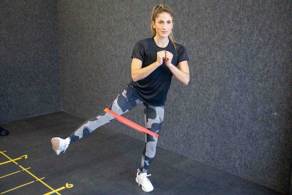 - Переместите левую ногу в сторону, чтобы растянуть ленту. Остальная часть вашего тела должна оставаться на месте.