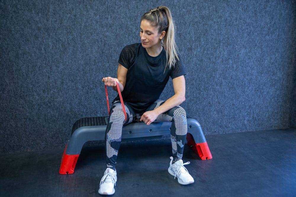 - Поднимите эластичную ленту под правым коленом и держите ее правой рукой.