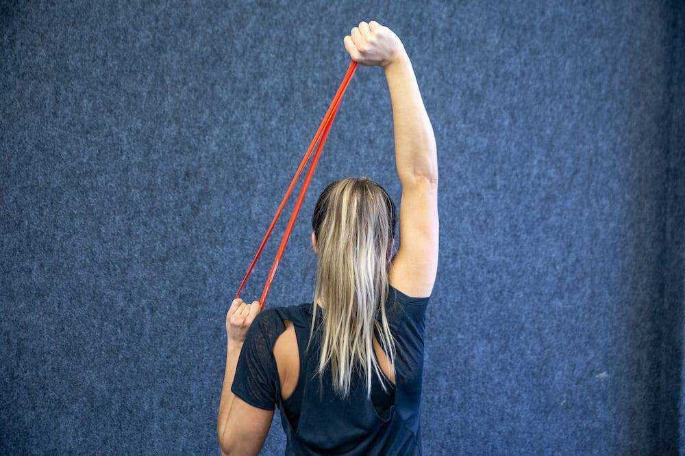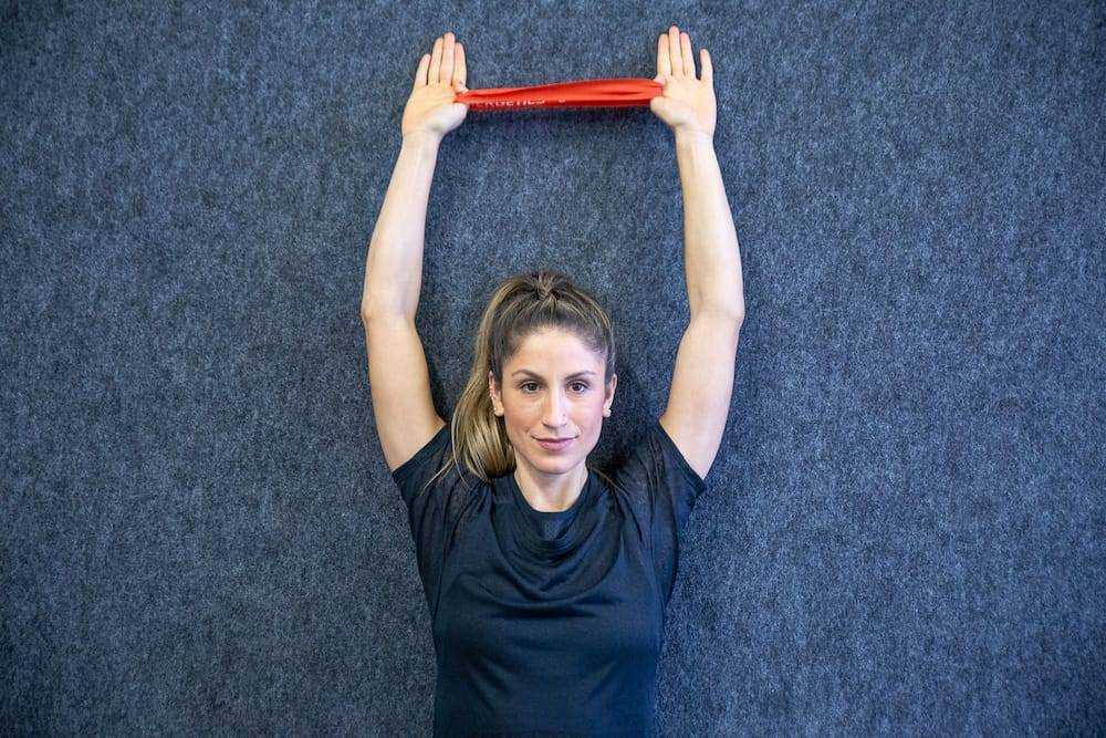 - Поместите эспандеры вокруг ваших больших пальцев или запястий и вытяните руки прямо над головой.