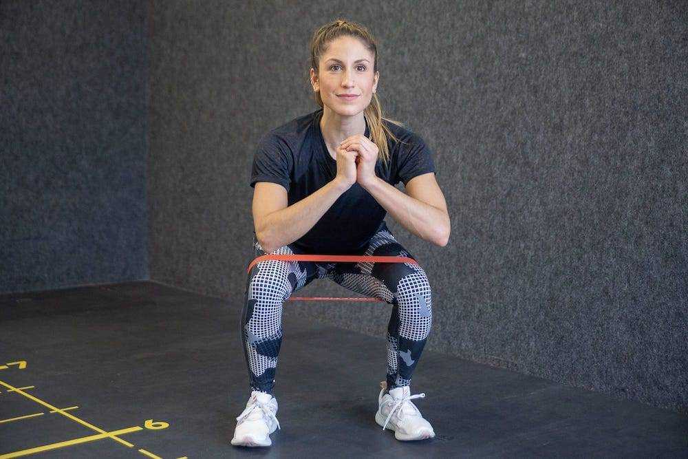 Расставьте ноги на ширине плеч, затем завяжите ленту чуть выше колен и приседайте до предельного натяжения резинки.