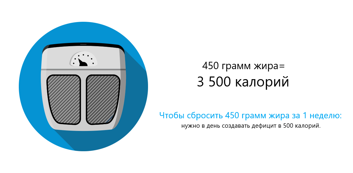 Диетологи говорят, что для того, чтобы терять пол килограмма в неделю, нужно поддерживать дефицит в 3500 калорий.