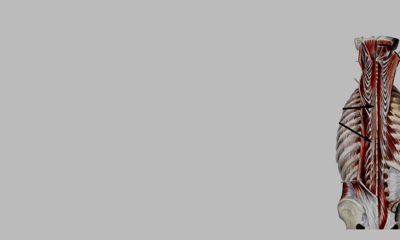 Мышца выпрямляющая позвоночник(поперечно-остистая), является самой длинной и сильной спиной мышцей. Она проходит по всей длине позвоночника, от головы до таза. Находится постоянно под нагрузкой, так как удерживает нашу спину в ровном положении. Благодаря этому мы и можем ходить на двух ногах. Свое начало мышца берет от внутренней(дорсальной) поверхности крестца: длинных и коротких отростков поясницы. Так же крепится к 8-9 ребрам(пояснично-грудная фасция). И далее тянется к затылку. Нижние пучки этой мышцы укрепляют ребра, тем самым создают прочную опору для диафрагм