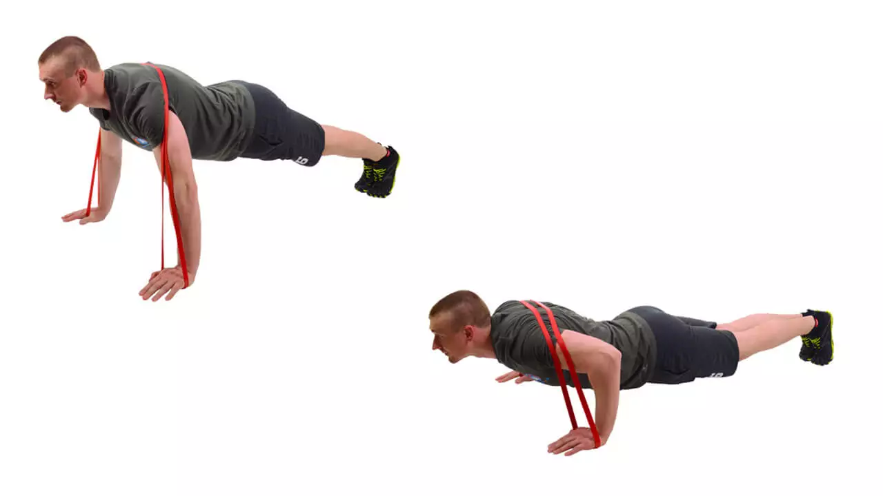 Это упражнение можно выполнить и в виде отжиманий от пола, взяв ленту в ладони и расположив на уровне груди поперек спины. Еще жим можно сделать в вертикальном положении стоя или сидя. Так как отжимания мы уже рассмотрели, давайте разберем жим фитнес-ленты стоя.