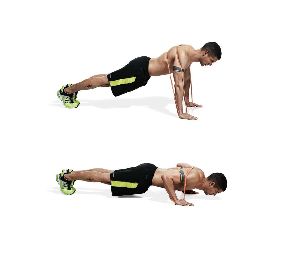 Поместите резиновый жгут за спиной, после чего займите положение для отжиманий, прижав другую сторону резинки руками к полу. Держа мышцы пресса и корпуса в осознанном напряжении, распрямите руки и оттолкнитесь как можно выше вверх, затем медленно вернитесь в исходное положение.