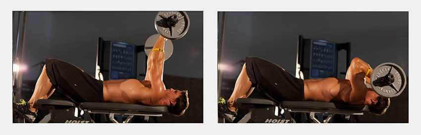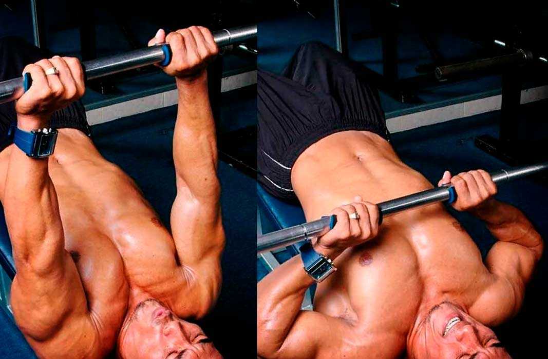 Для тренинга понадобится узкая скамья и изогнутый EZ-гриф. Исходное положение – лежа на спине, гриф необходимо держать средним хватом на вытянутых руках на месте его излома
