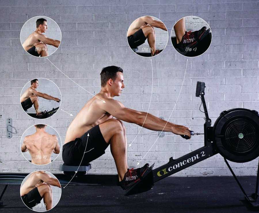 Безошибочная техника выполнения упражнений на гребном тренажере должна обеспечивать активную работу как верхней так и нижней частей тела. Например, при беге или езде на велотренажере задействована по большей части только нижняя часть тела. А при тренировке на гребном тренажере работает практически все тело.