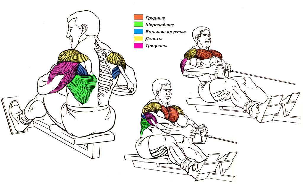 - Подтягивание рукоятки на близкое расстояние к поясу (за счет бицепса).