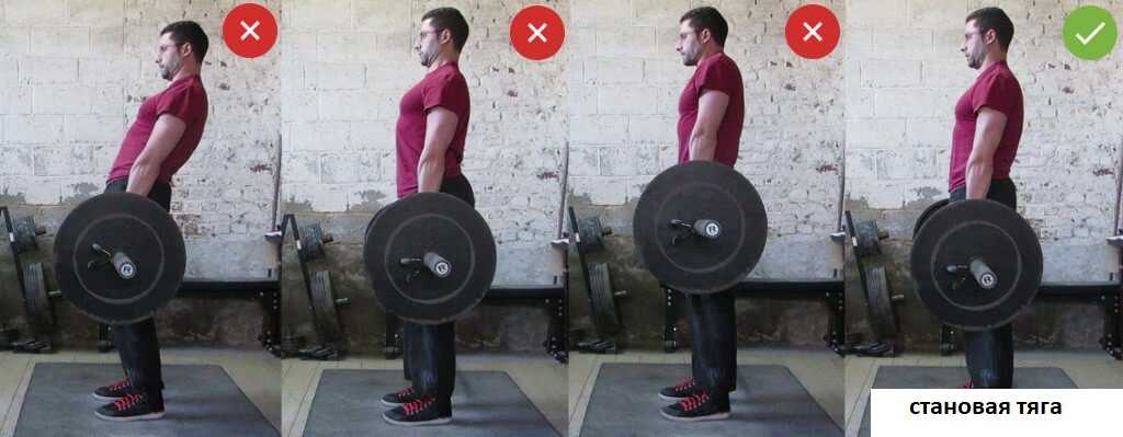 На этом изображении показаны как правильные, так и неправильные положения тела в конечной фазе подъема (локаута), которые приводят к полной или частичной активации ягодичных мышц.