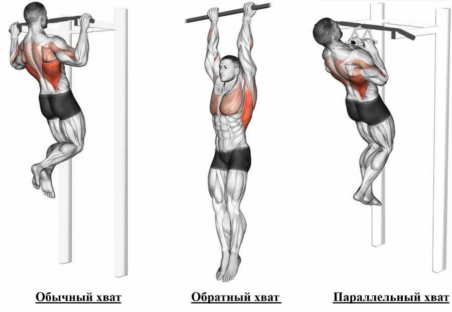 » Прямой. Обхватите перекладину так, чтобы большой палец оказался кнаружи. » Обратный. Обхватите перекладину так, чтобы большой палец оказался кнаружи. » Разноименный (разнохват). Пальцами одной руки обхватите перекладину прямым хватом, а другой — обратным.