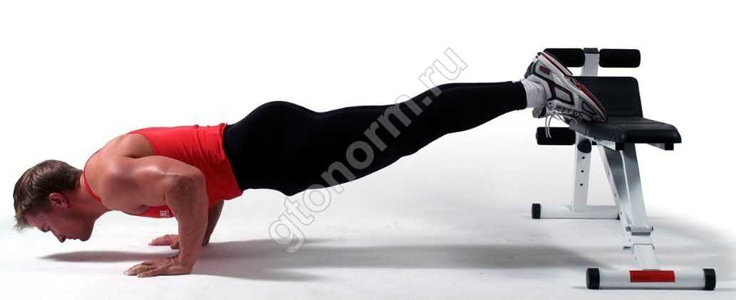 Это облегченный вариант предыдущего отжимания на ширину плеч, он выполняется с опоры, которая позволяет установить корпус под углом не менее 50°.
