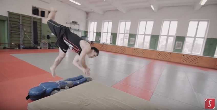 — Сделайте хороший разбег и ставьте ногу на небольшое, специально созданное возвышение (бордюр, гимнастический мостик, манекен для самбо или что-то другое). Это позволит поставить ногу в правильное положение, нога будет впереди от центра тяжести, будет немного согнута, и это позволит иметь дополнительный запас высоты перед заходом в элемент.