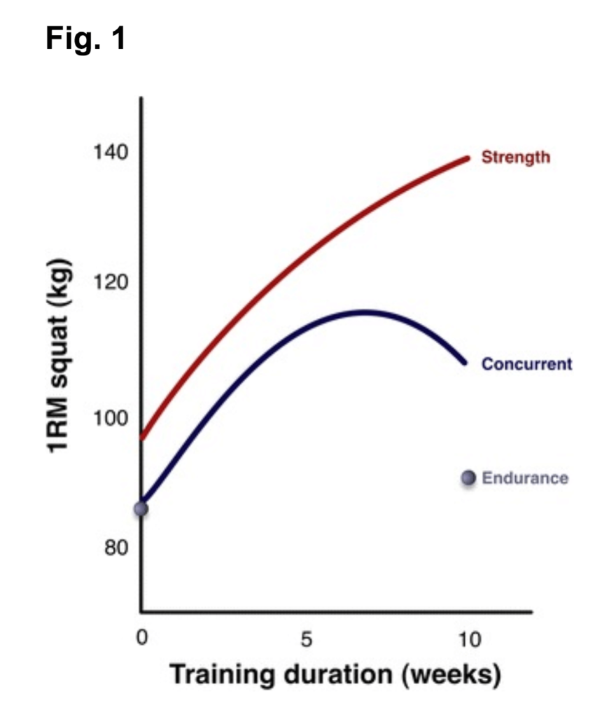 Иллюстрация из работы Баара 2014-го. Прогресс в первые 5 недель схожий, но после седьмой в группе совмещенных тренировок результат хуже (по сравнению с группой, которая занимается только силовыми).