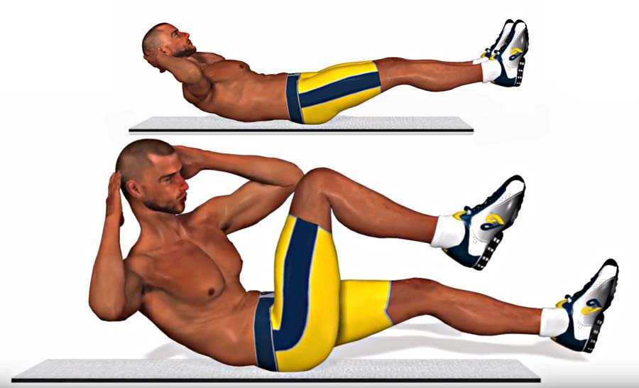 - «велосипед» — ложимся на спину и начинаем подтягивать поочередно колени к противоположному локтю. Получается, что левое колено стремится к правому локтю, и наоборот. Руки держим за головой. Когда одна нога тянется к локтю, другая должна быть полностью прямой и не касаться пола. Выполняем 2 подхода по 8 раз