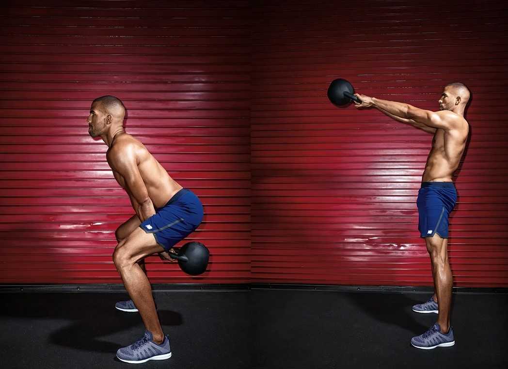 Как утверждают многие специалисты, представленное упражнение является лучшим для новичков, поскольку в данном случае не требуется поднимать гирю выше уровня головы. Представленное упражнение активизирует работу практически всех групп мышц, особенно мышц плеч, ног и спины. Выполняется оно следующим образом: