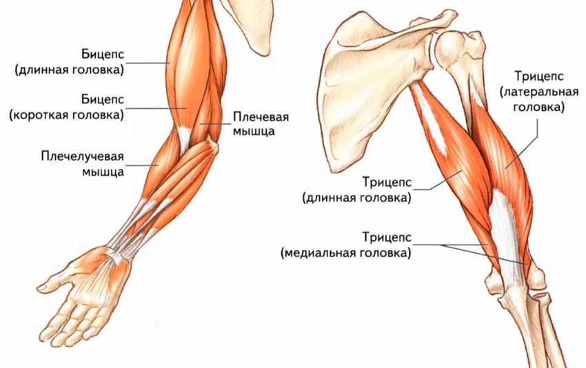 - собственно, плечевые мускулы, идущие от дельтовидных до локтя,
