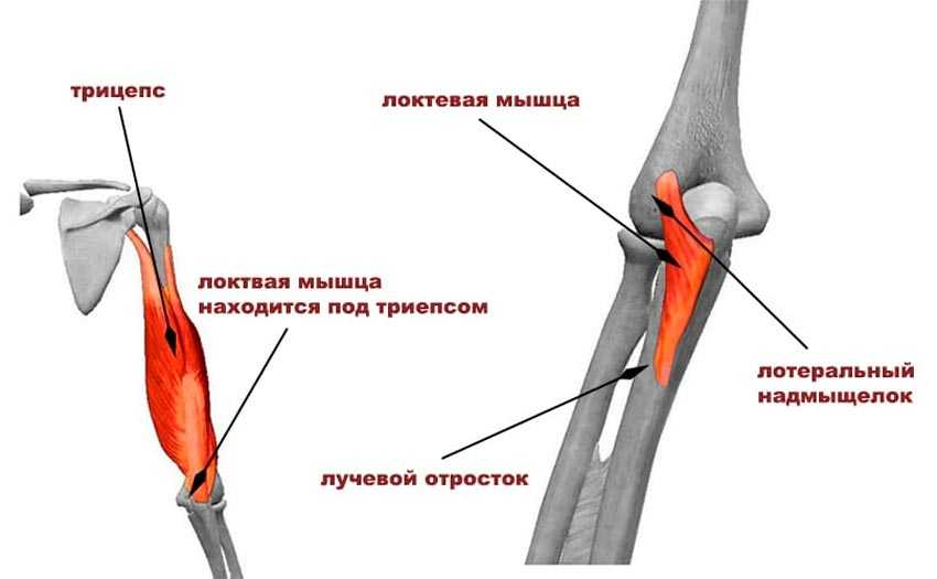 Принимает непосредственное участие в разгибании предплечья в локте. Образует заднюю поверхность руки и прикреплена к локтевому отростку. Последнее и дало название этой мышце. Синергист трицепса накачивается при выполнении упражнений на разгибание.