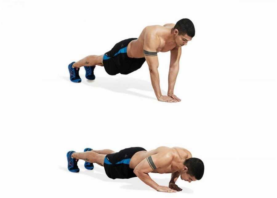 Исходное положение: принимаем классический упор лежа, располагаем руки на ширине плеч как в классической вариации. Однако, как уже говорилось выше, расстояние между ладонями можно менять, в зависимости от желания нагрузить ту или иную мышечную группу. В качестве возвышенности может быть что угодно — стул, табуретка, скамья, фитбол и даже петли trx. Корпус должен быть абсолютно прямым от головы до пяток без прогиба в спине. Пресс и спина находятся в напряженном статическом состоянии.