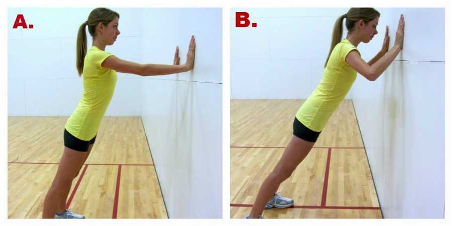 - Встаем напротив стенки на расстоянии примерно одного метра и упираемся на вытянутые руки, на уровне плеч.