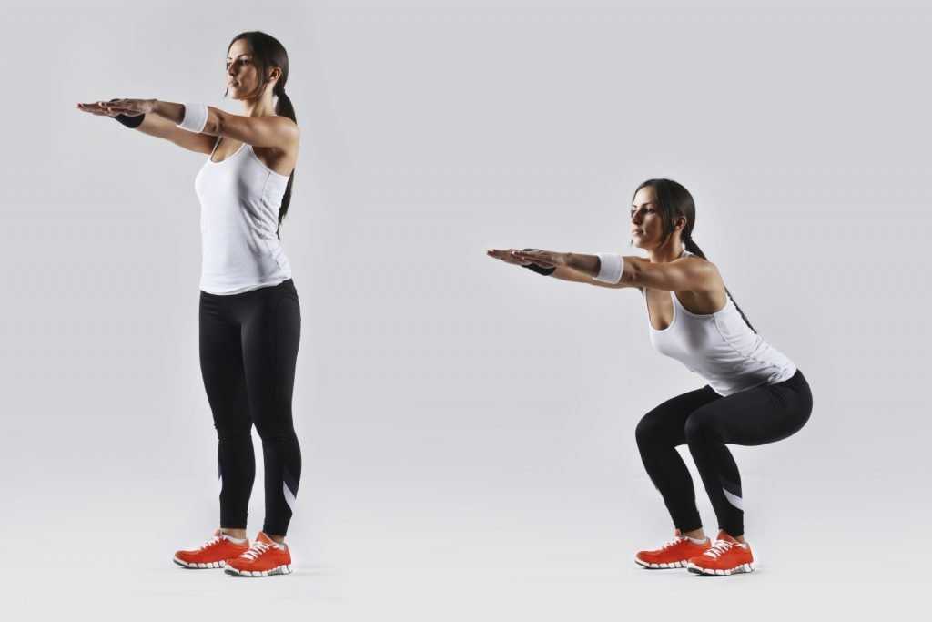 Исходное положение — стоя, ноги на уровне плеч, руки согнуты в локтях перед собой, взгляд устремлен прямо, живот втянут. Необходимо медленно начать приседание, отводя копчик назад, колени не заходят за линию пальцев ног, а пятки — отрываться от земли, в нижнем положении задержаться на 2-4 секунды и выпрямиться. Начать тренировку следует с 15-20 повторений по 3 подхода.
